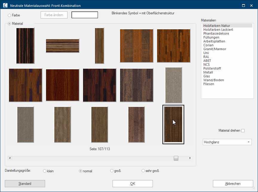 - Vervolgens opent zich de neutrale materiaalkeuze. De actuele gekozen textuur wordt door een kader gekenmerkt. Via deze dialoog kunt u nu een andere textuur of kleur kiezen en zelf de materiaaleigenschappen zoals de richting van de textuur wijzigen. Zie ook: De materiaalkeuze