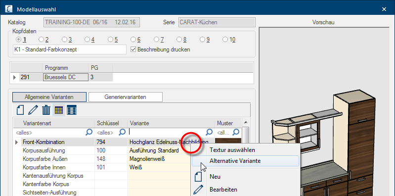 - Om een alternatief programma of een alternatieve variant aan te kunnen maken, klikt u eerst met de linker muisknop op de betreffende regel in de modelkeuze. Vervolgens wordt een contextmenu geopend dat u kunt gebruiken om de betreffende functie te selecteren. In de volgende afbeelding werd bijvoorbeeld de variant frontcombinatie gekozen, om een alternatieve variant vast te leggen.
