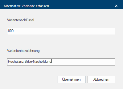 - Zodra u via het contextmenu de optie alternatieve varianten gekozen heeft, wordt een dialoog geopend, waarin u de voor de bestelling noodzakelijke programma- of variantensleutel alsook de programma- of variantenbenaming handmatig kunt invoeren.