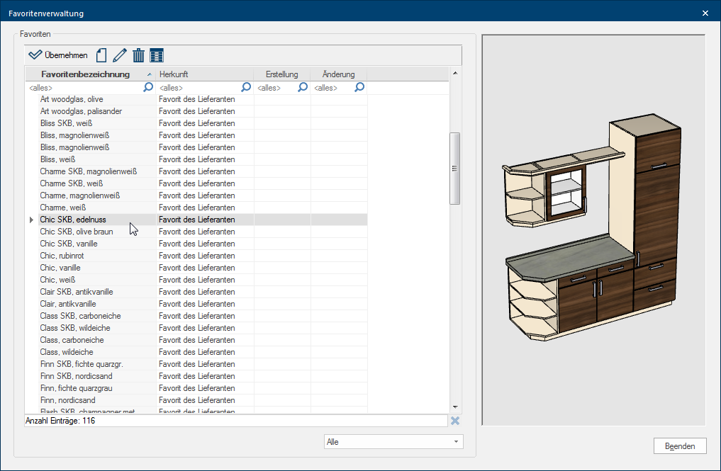 In de modelkeuze van CARAT heeft u daarvoor de beschikking over de functie Favorieten. Iedere leverancier kan, indien gewenst, met zijn IDM IDM staat voor "Intergriertes Datenmodel" (= geïntegreerd gegevens model) en staat voor het verder ontwikkelde VdDK-gegevens formaat (Verband der Deutschen Küchenindustrie). Dit gegevens formaat dient voor de systematische invoer van de catalogi-gegevens van de keuken-industrie.-leveranciersgegevens ook willekeurig veel favorieten aanbieden. Na het inlezen van een catalogus staan deze favorieten in de modelkeuze ter beschikking.