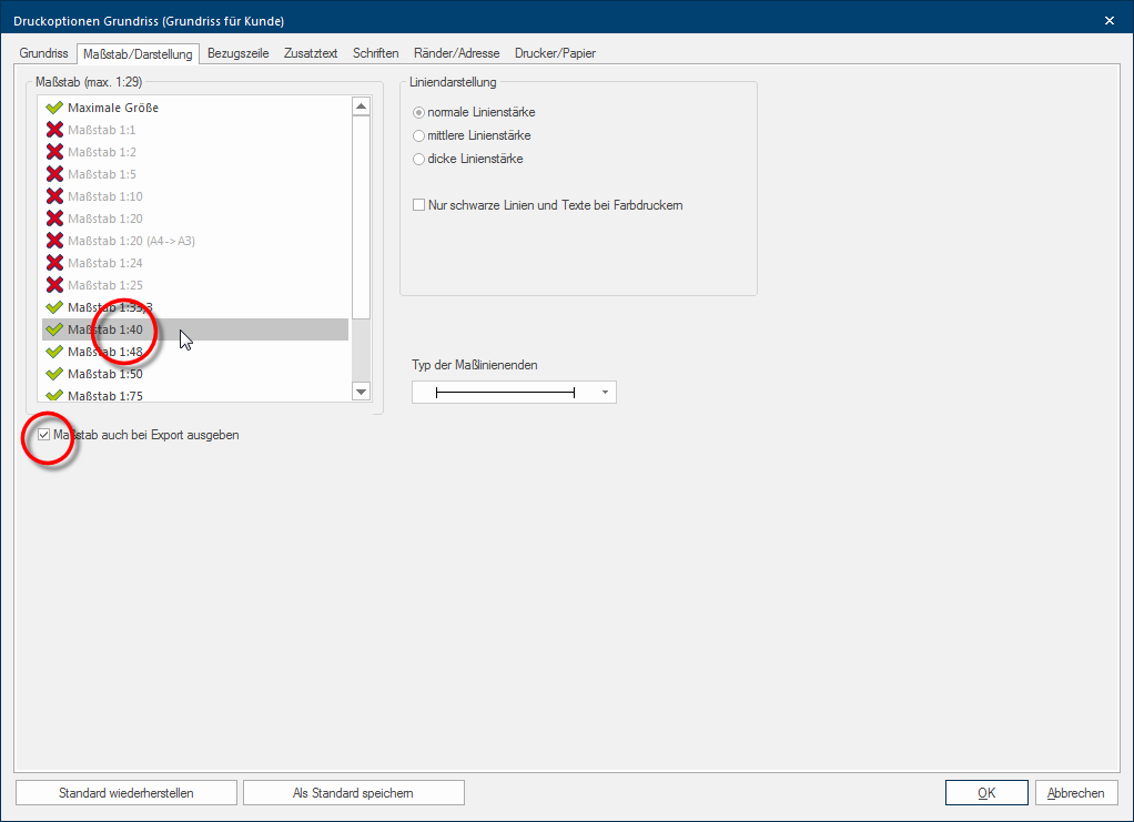 - Gebaseerd op het gebruikte papierformaat, de pagina oriëntatie en de gekozen opties voor het grafische printen worden u op dit tabblad alleen die schalen aangeboden, die met de actuele instellingen ook printbaar zijn. Want, wanneer u naast de zuivere plattegrond ook nog de maatlijnen of de stuklijst wilt printen, kan het werkelijke printgedeelte voor de grafiek kleiner worden. Bij de opsomming van de schalen heeft CARAT hiermee al rekening gehouden, waardoor niet alle schalen beschikbaar zijn.