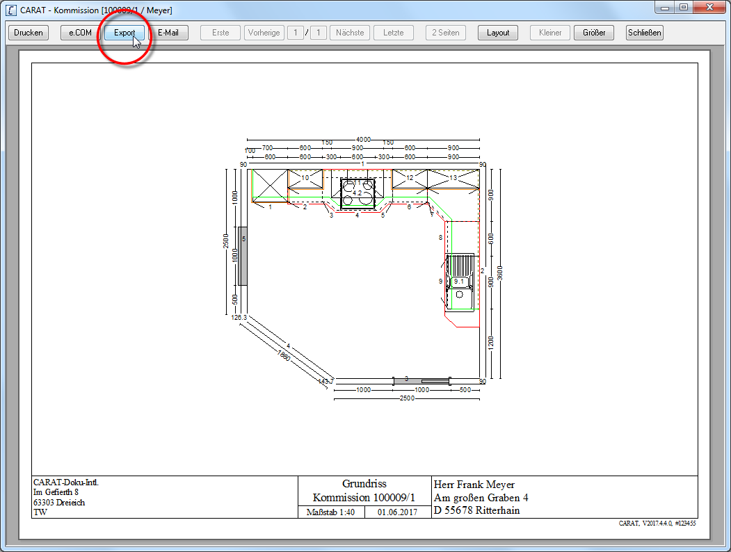 Meestal zult u alle tekeningen nodig voor een offerte, opdracht of bestelling, zoals de plattegrond, het frontaanzicht, het installatieplan en het tegelplan, alsmede alle variaties van de perspectiefweergave, op papier uitprinten om die te bekijken, of als PDF Het Adobe Portable Document Format (PDF) werd in de 80-er jaren door Adobe Systems ontwikkeld en geperfectioneerd. Adobe PDF-bestanden bevatten gegevens uit verschillende toepassingen, die op iedere computer kunnen worden getoond, en ze zijn dus geschikt voor de uitwisseling met gebruikers in de hele wereld. versturen per e-mail E-Mail (van Engels electronic mail, elektronische post/brief; kortweg ook Mail) staat voor een op een brief lijkende boodschap die op elektronische weg in computer netwerken wordt overgedragen. of e.COM. Maar soms kan het echter gebeuren, dat u een met CARAT gemaakte grafiek, ter verdere bewerking, ook als bestand nodig heeft.