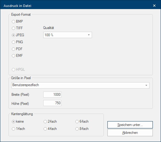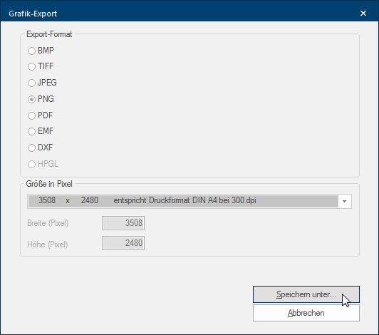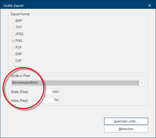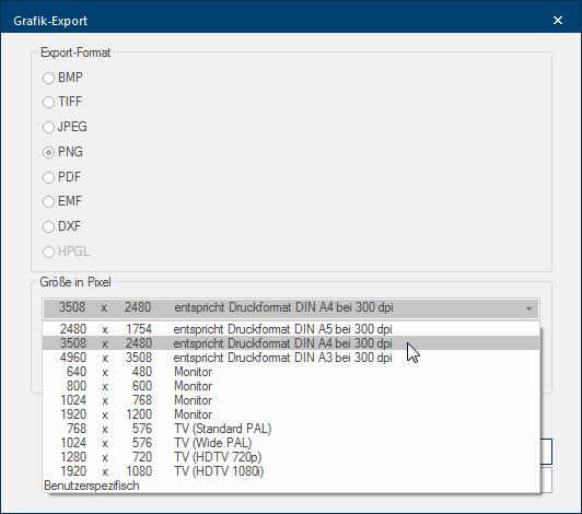 - Vervolgens gaat de dialoog Speciale vensters in software-toepassingen worden dialoog, dialoog venster of dialoog veld genoemd. Dialoog vensters worden in verschillende situaties van de toepassing getoond om bepaalde invoer of bevestigingen van de gebruiker te verkrijgen. Grafiek-Export open, die u kunt gebruiken om grafiek relevante instellingen, zoals het formaat of de grootte in pixels Pixel, beeldpunt of beeldelement, betekent zowel de kleinste eenheid van een digitale raster grafiek als ook haar weergave op een monitor met raster-besturing. (resolutie Met de beeld resolutie omschrijft men gewoonlijk het aantal pixel (beeldpunten) waaruit een raster grafiek bestaat. Meestal wordt deze in breedte x hoogte vermeld.), te kunnen maken.