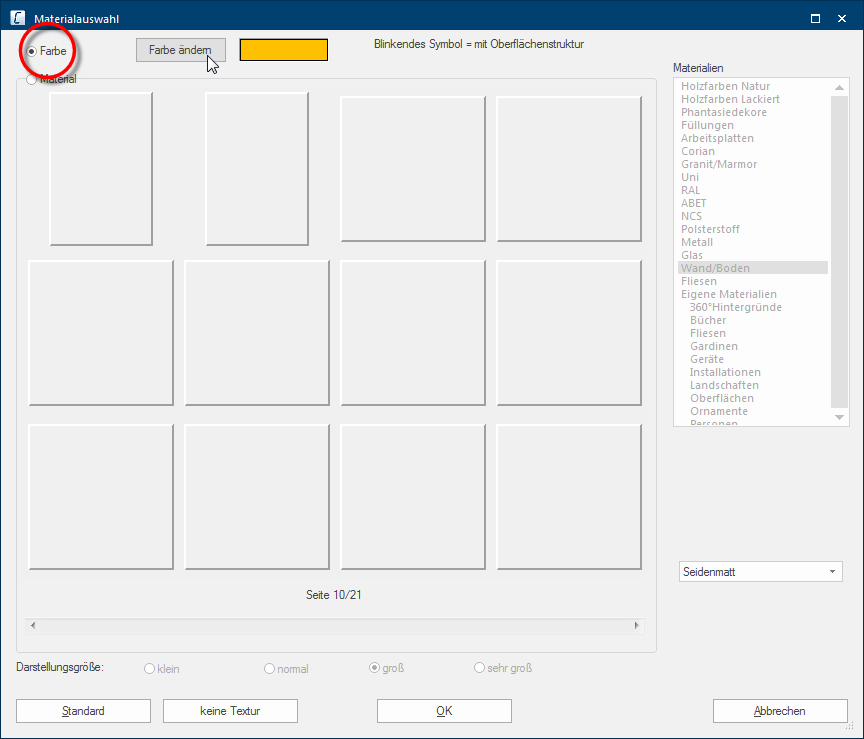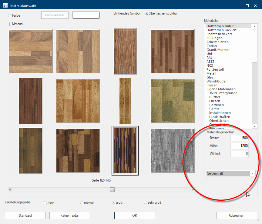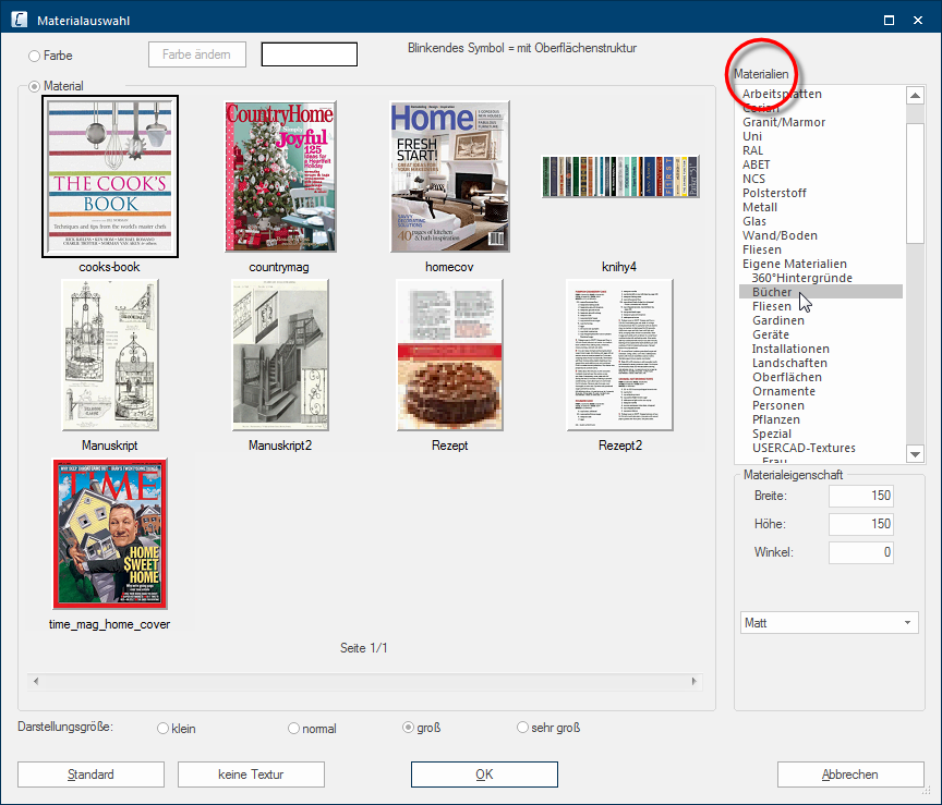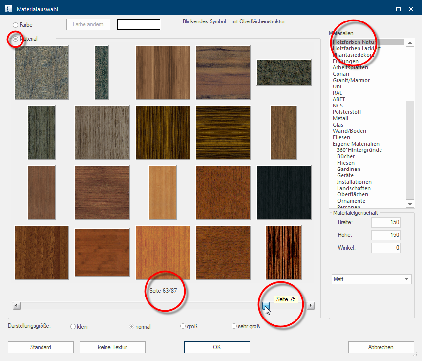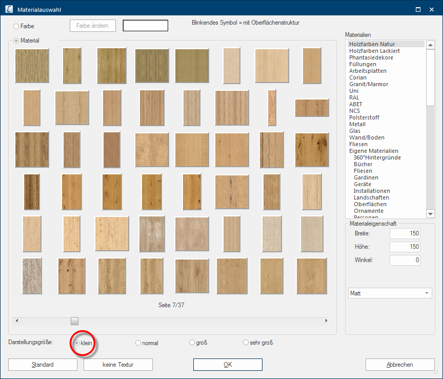 Onder de materiaalkeuze kunt u de weergavegrootte van de texturen voor de daar bovenstaande preview wijzigen. Bij een kleinere instelling worden duidelijk meer texturen per pagina getoond. Bij een grotere instelling worden wel is waar minder texturen getoond, u kunt daardoor echter het individuele motief van een textuur beter herkennen.