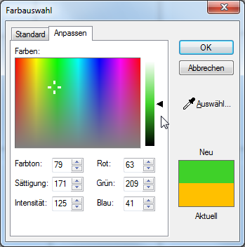 Nadat u het keuzerondje Kleur heeft geactiveerd, kunt u de vrije kleurkeuze van Windows gebruiken, waarmee u een willekeurige kleur kunt creëren. Klik Voor zoverre niet anders aangegeven wordt de linker muisknop een keer kort gedrukt. Door het klikken wordt steeds een object gemarkeerd of bij het klikken op en knop, wordt de beschreven actie uitgevoerd (b.v. OK, Beëindigen, Sluiten). op de knop Kleur wijzigen om de kleurkeuzedialoog van Windows te openen.