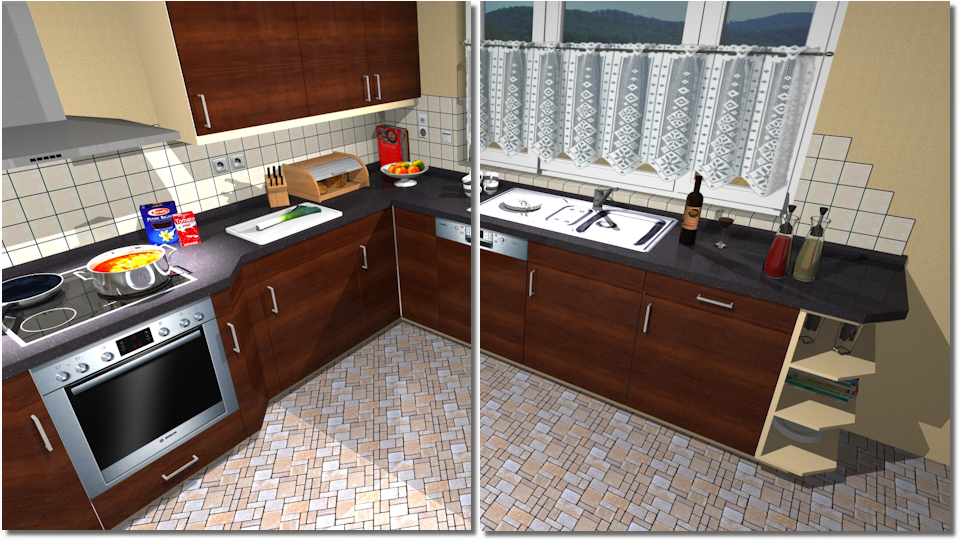 - In het hieronder getoonde voorbeeld ziet u een textuur als vloerbedekking, die in het linker voorbeeld met een hoek van 45° werd ingepland en zodoende diagonaal in de ruimte verloopt. In het rechter voorbeeld werd dezelfde textuur ingepland met een hoek van 0° en zodoende parallel loopt met de muur met het venster Programma´s en bestanden worden onder Windows (Engels= venster) in vensters weergegeven. In CARAT wordt voor ieder aanzicht (b.v. plattegrond, artikel invoer, frontaanzicht, perspectief enz.) een eigen venster geopend. Zo kan u verschillende vensters voor de bewerking tegelijk zien. Als in één venster iets veranderd wordt, heeft dit automatisch een uitwerking op alle andere vensters. en het keukenblok.