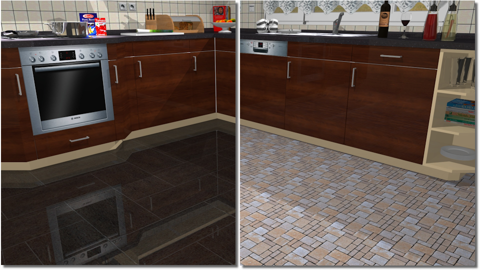- In het linker gedeelte van de volgende afbeelding ziet u een textuur als vloerbedekking die is voorzien van de eigenschap hoogglans. In het rechter gedeelte is voor de textuur de eigenschap mat gebruikt.