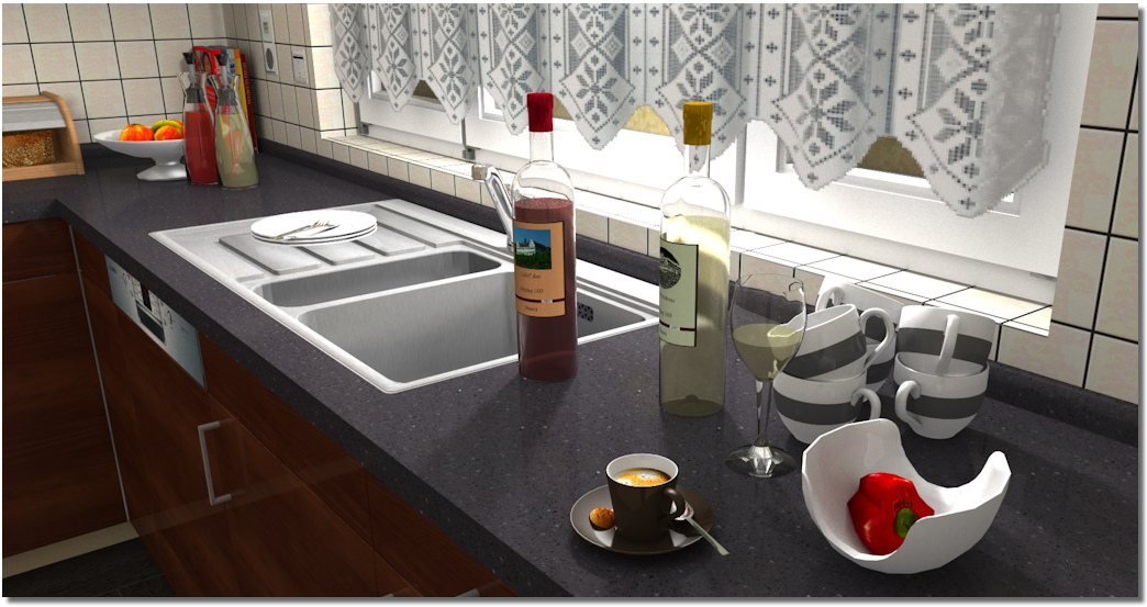De volgende grafiek moet een indruk geven over welke effecten de verschillende materiaaleigenschappen kunnen creëren. Voor het werkblad is gekozen voor de instelling zijdemat. Voor de glasflessen is de instelling lichtbrekend gebruikt en voor de vloeistof erin de eigenschap matglas. Voor het porseleinen servies is de eigenschap keramiek ingesteld, om daardoor de speciale glans te krijgen.