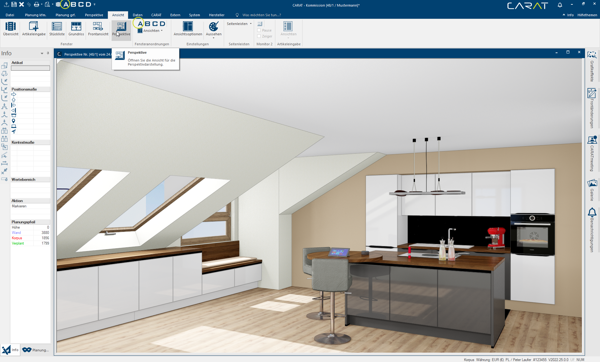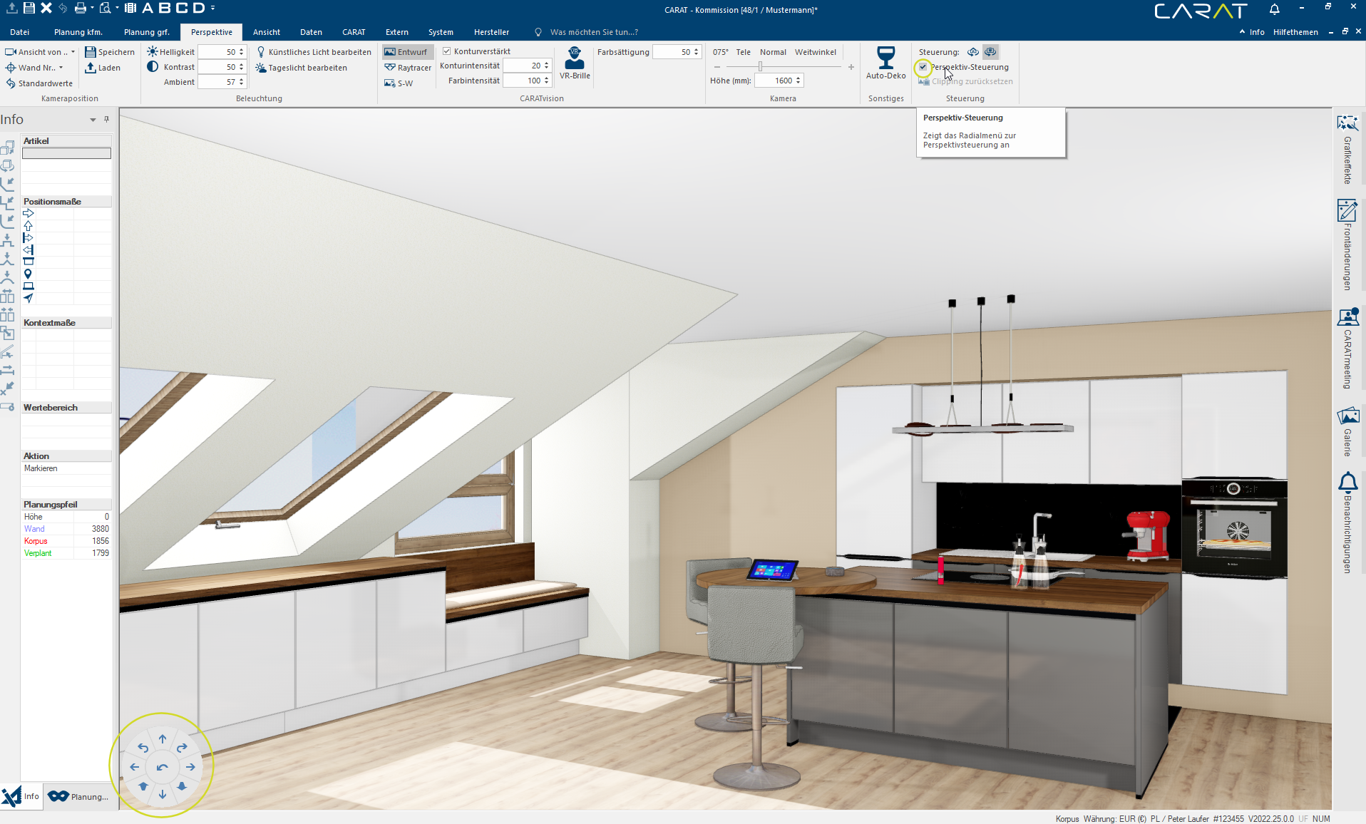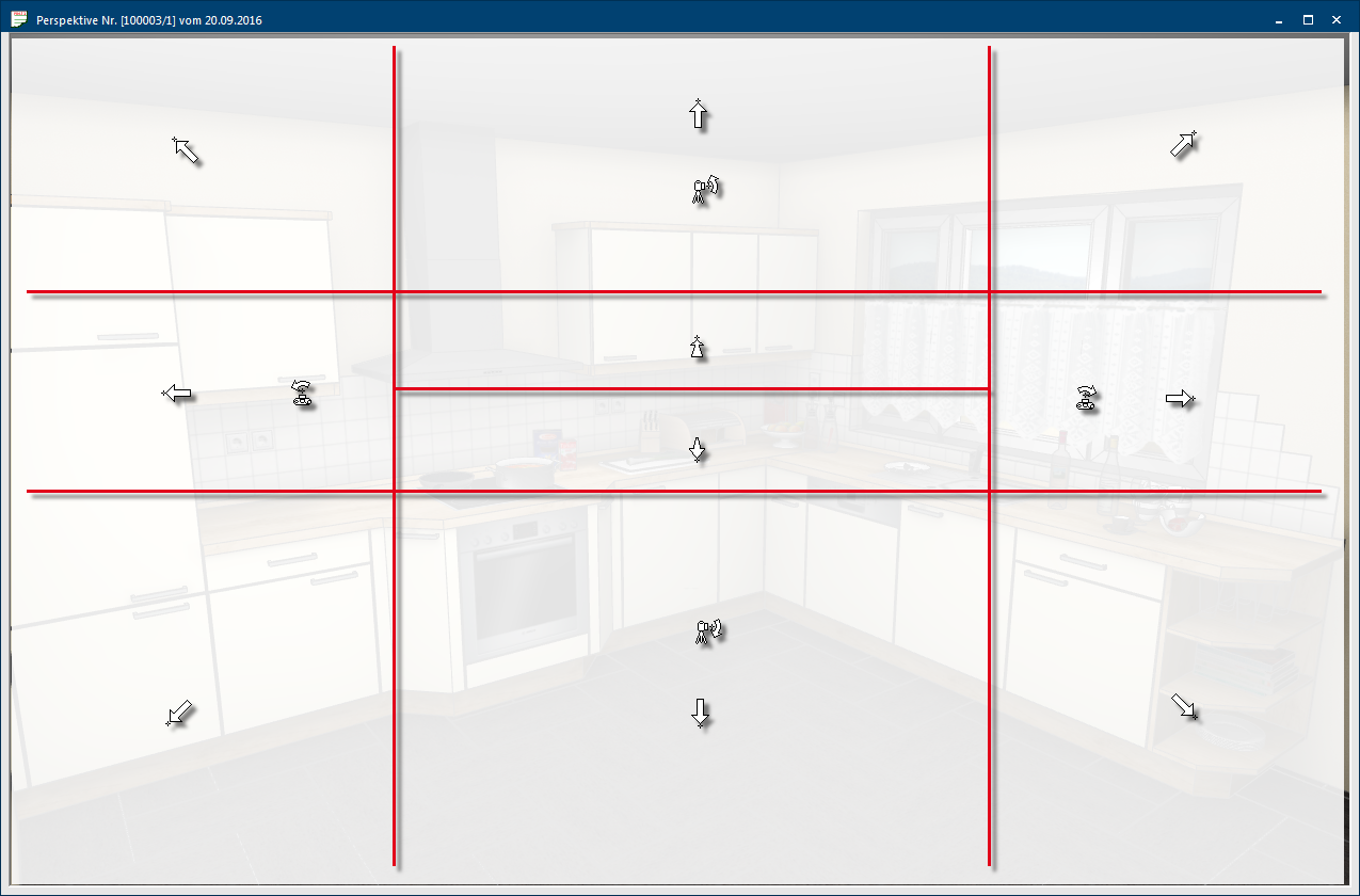 - Met de besturingsmogelijkheden in CARAT kunt u de gehele ruimte, inclusief alle geplande artikelen, voor de camera heen en weer schuiven, draaien of zelfs kantelen. Om bijvoorbeeld via de ruimtedraaiing de keuken in het perspectiefvenster te vergroten, zou u nu de keuken naar de camera toe schuiven. Om de keuken in het perspectiefvenster te verkleinen, schuift u de ruimte van de camera weg.
