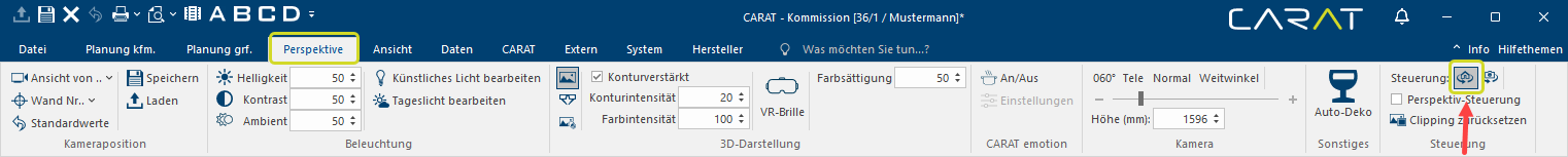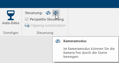 Via de sturing groep kan gewisseld worden tussen de cameramodus en de ruimtedraaiing. Bovendien kan hier ook de Perspectiefsturing, het radiaalmenu dat reeds eerder beschreven is, in- en uitgeschakeld worden. Door op Clipping terugzetten te klikken kunt u een clipping lijn terugzetten. Als er geen clipping lijn is ingesteld is dit veld grijs is.
