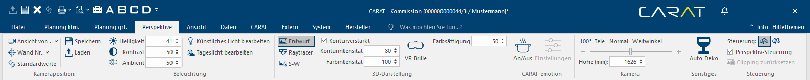 CARAT is in staat om op iedere moment tijdens de planning ook een perspectief weergave van de scène te tonen. Voor de weergave in perspectief kunt u de virtuele camera vrij in de scène bewegen. Daardoor kunt u iedere positie in en buiten de ruimte bereiken. Naast de gangbare beweging van de virtuele camera kunt u als alternatief ook de ruimte vóór de virtuele camera bewegen. Afhankelijk van de vereisten, kunt u te allen tijde wisselen tussen de cameramodus en ruimtedraaiing.