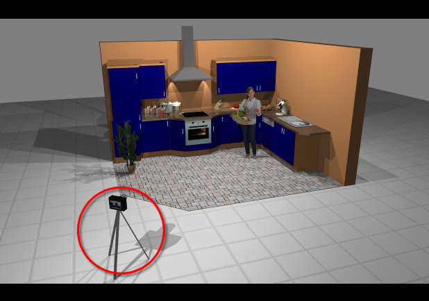 - Als u de ruimte van de camera wegschuift, verkleind zich hierdoor de afbeelding van de keuken in het perspectiefvenster.