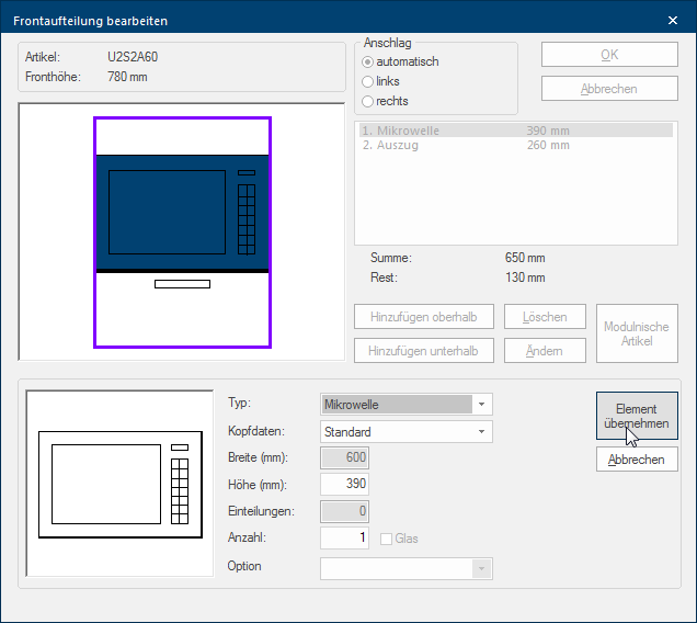 Via de dialoog Speciale vensters in software-toepassingen worden dialoog, dialoog venster of dialoog veld genoemd. Dialoog vensters worden in verschillende situaties van de toepassing getoond om bepaalde invoer of bevestigingen van de gebruiker te verkrijgen. Frontindeling wijzigen heeft u uitgebreide mogelijkheden ter beschikking om de frontindeling van een artikel naar uw wensen vorm te geven. In het gedeelte linksboven wordt de originele artikelnaam alsook de totale fronthoogte getoond. In het voorbeeldvenster wordt de korpus met de actuele frontindeling en de bijbehorende greeppositie per frontelement getoond. In het gedeelte rechtsboven kunt u voor het artikel de scharnier van de deuren wijzigen. Hier ziet u ook een lijst met de frontelementen. In het onderste gedeelte heeft u de mogelijkheid een willekeurig frontelementen uit te kiezen en daarbij passende instellingen te maken.