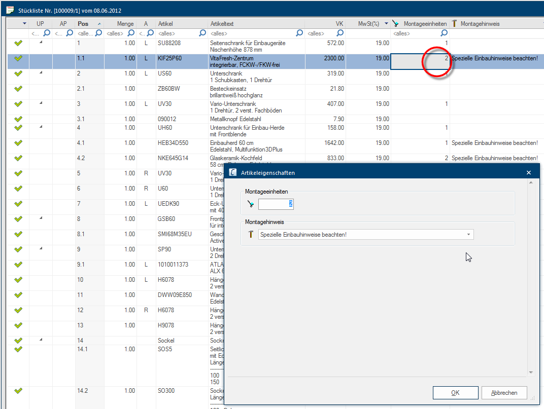 Om een artikelkenmerk voor een artikel in te vullen, is het voldoende om in het veld een artikelkenmerk in de artikelregel aan te klikken. Vervolgens wordt een dialoog met alle ter beschikking staande artikelkenmerken geopend. Nadat u alle instellingen heeft gedaan, kunt u de dialoog met een klik op de knop OK sluiten.