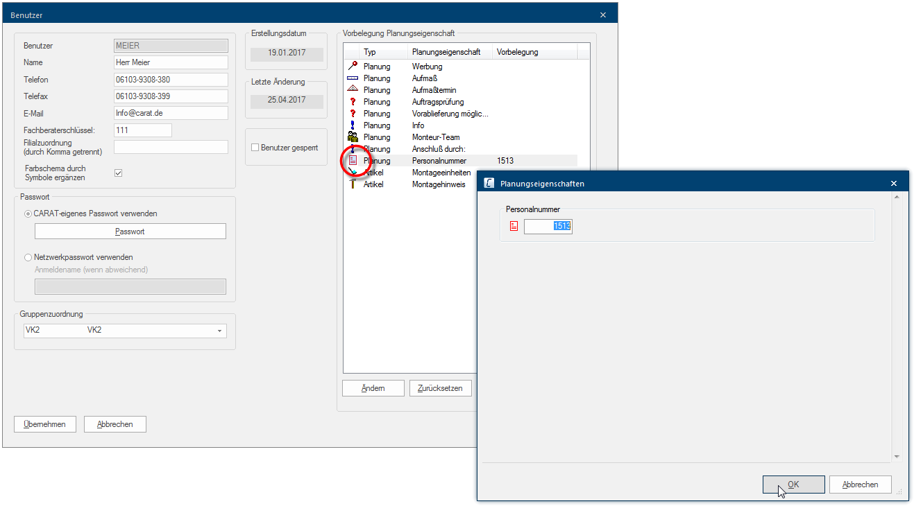 Bij het aanmaken van plannings- en artikelkenmerken kunt u ook vastleggen, welk gebruikersgroepen een kenmerk bewerken mag. Indien gewenst kunt u vervolgens in het gebruikersbeheer voor ieder gebruiker ook een voorinstelling voor een plannings- en artikelkenmerk vastleggen, om de invoer daardoor nog gebruikersvriendelijker te maken.