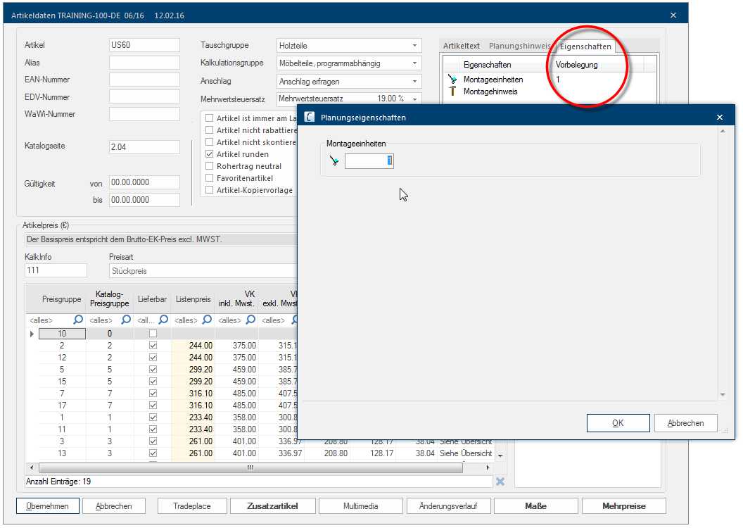 Ook voor een artikel heeft u de mogelijkheid een voorinstelling in te voeren, die vervolgens bij het inplannen van het artikel automatisch gebruikt wordt. De voorinstellingen voor individuele artikelen wordt gedaan via de artikelgegevens. Voor zover artikelkenmerken aangelegd en geactiveerd zijn, kunnen deze ingesteld worden via het tabblad rechts boven in de dialoog Artikelgegevens. Ook hier is een dubbelklik op een kenmerk voldoende om het te kunnen bewerken.