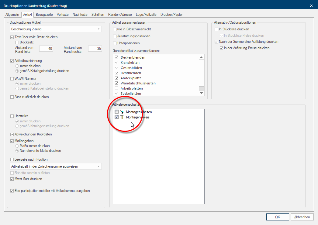 De actieve plannings- en artikelkenmerken worden daarvoor getoond in een lijst rechts onder op het tabblad in het betreffende gedeelte. Hier kunt u de plannings- en artikelkenmerken, die geprint moeten worden, via het betreffende aankruisvakje Het aankruisvakje (Engels: Checkbox) is een standaard element van een grafische gebruikersinterface. Een checkbox heeft meestal twee toestanden (aangekruist of niet aangekruist). Dit komt in het algemeen overeen met een ja/nee keuze. activeren. Een vink symboliseert, dat het plannings- of artikelkenmerk op het document geprint wordt. Een nieuwe klik deactiveert de keuze.