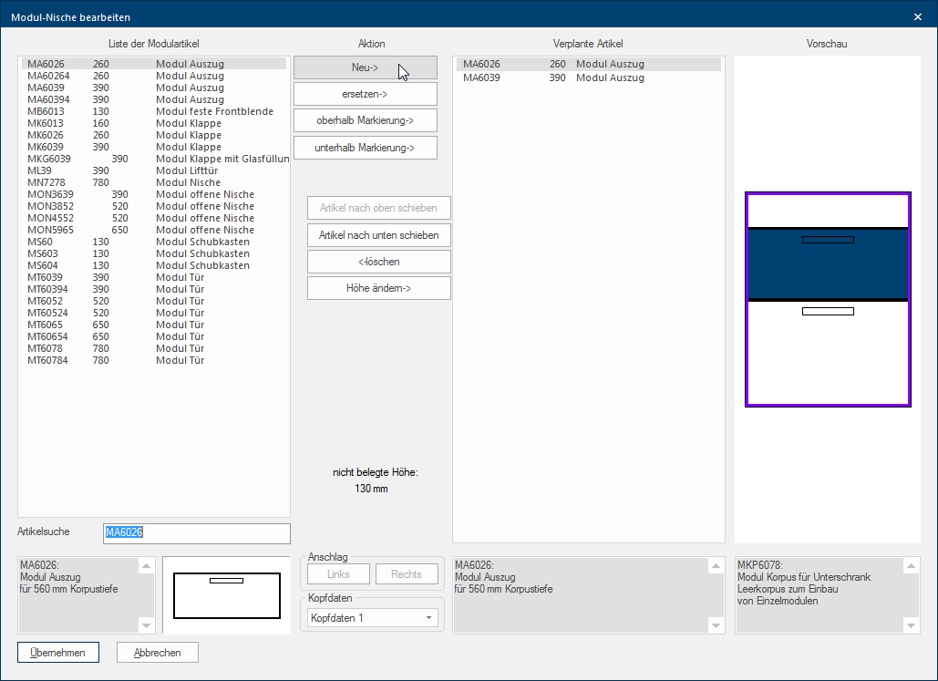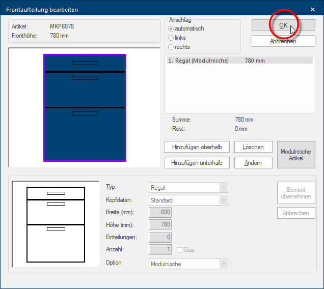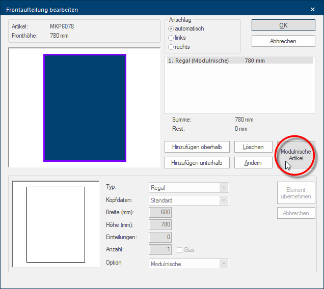 U kunt de actuele indeling van de frontelementen grafisch controleren via de preview. Dit is i het bijzonder voor de positie van de aanslag van de deuren zeer behulpzaam. Onder de preview ziet u steeds de beschrijving van de gebruikte module-korpus. |