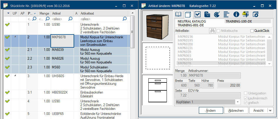- Indien nodig kunt u de toegepaste frontelementen nog in hoogte wijzigen, afwijkende hoofdgegevens Hoofdgegevens is in CARAT het hyperoniem voor alle gegevens die voor de weergave en de bestelling van een keuken nodig zijn. Dit zijn bijvoorbeeld het gekozen programma of de varianten zoals de uitvoering van de korpus uitvoering of de werkblad kanten. toewijzen, een relevante aanslag bij deuren kiezen of de positie binnen de lijst van de geplande artikelen veranderen.