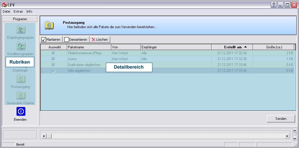 De verzenddialoog van het filiaalbeheer is in twee hoofgedeeltes opgedeeld. Aan de linkerkant bevinden zich de rubrieken, waar u de diverse mogelijkheden van het filiaalbeheer kunt openen. Na het openen van de verzenddialoog is automatisch eerst de rubriek Uitbox geopend. Hierdoor kunt u sneller zien welke gegevenspakketten al klaar gezet zijn om te verzenden.